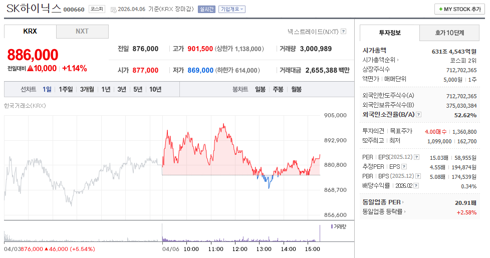 한국경제 마켓, 000660 시세/52주(2026-04-03 장마감)