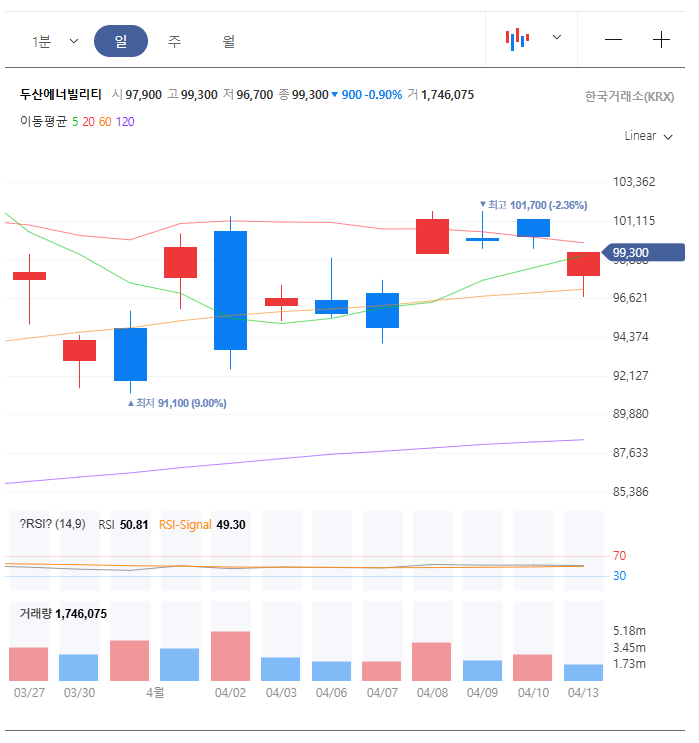1) 2026-04-13 종가 99,300원, 52주 밴드 0.86 구간입니다.