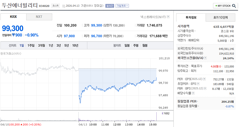 한국경제 마켓, 034020 시세/52주(2026-04-13 장마감)